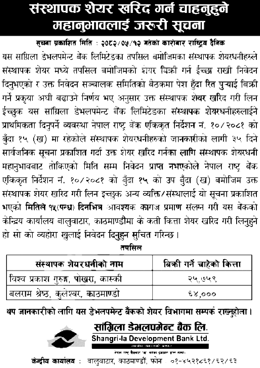 काठमाडौं । सांग्रिला डेभलपमेन्ट बैंक लिमिटेडले ८९ हजार ७५९ कित्ता संस्थापक शेयर सर्वसाधारणका लागि बिक्रीमा राखेको छ।
