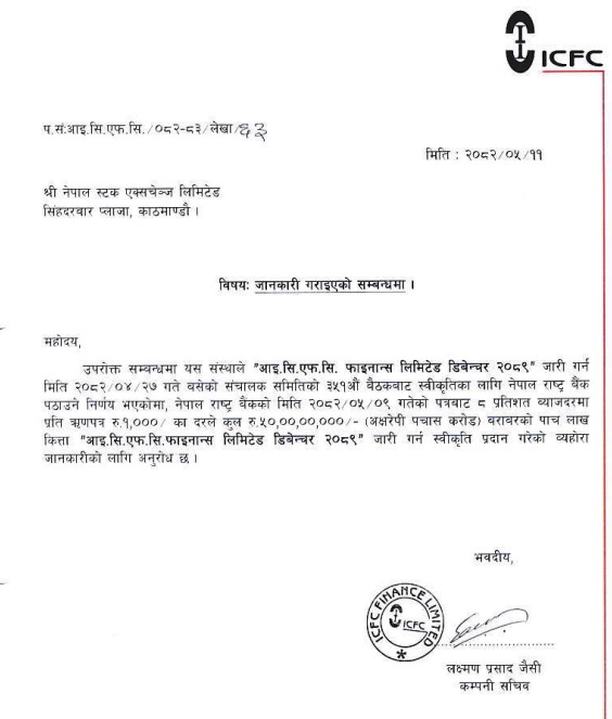 राष्ट्र बैंकले कम्पनीलाई ५० करोड रुपैयाँबराबरको रु. १ हजार अंकित दरका ५ लाख कित्ता भएको ‘आईसिएफसी फाइनान्स लिमिटेड डिबेञ्चर २०८९’ जारी गर्न अनुमति दिएको हो ।
