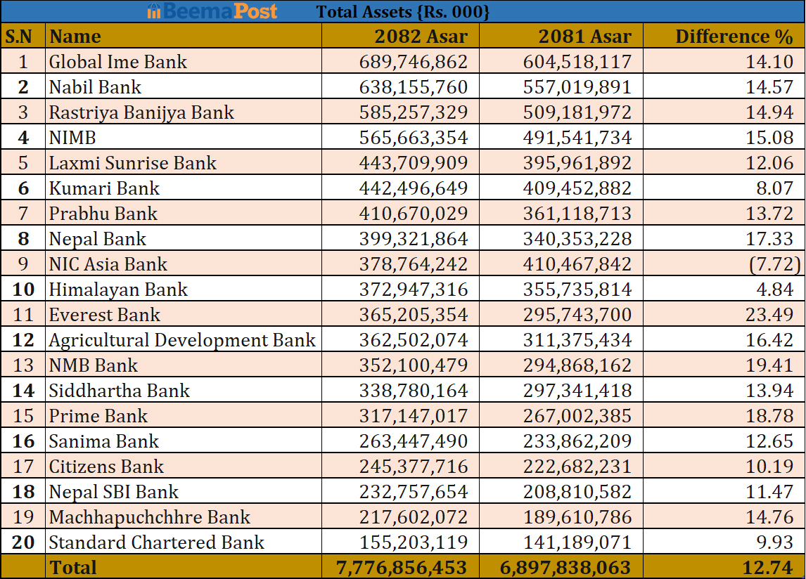 यसअवधिमा सिद्धार्थ बैंकको कुल सम्पत्ति ३ खर्ब ३८ अर्ब, प्राइम बैंकको ३ खर्ब १७ करोड, सानिमा बैंकको २ खर्ब ६३ अर्ब, सिटिजन्स बैंकको २ खर्ब ४५ अर्ब, नेपाल एसबिआई बैंकको २ खर्ब ३२ अर्ब, माछापुच्छ्रे बैंकको २ खर्ब १७ अर्ब र स्टान्र्डड चार्टड बैंकको १ खर्ब ५५ अर्ब रुपैयाँ रहेको छ ।