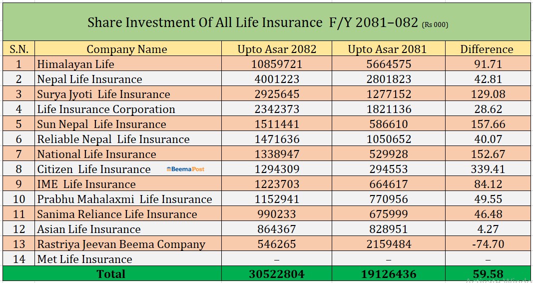 समीक्षा अवधिमा हिमालयन लाइफ इन्स्योरेन्स र नेपाल लाइफ इन्स्योरेन्सले सूचीकृत कम्पनीहरुको साधारण शेयरमा सबैभन्दा बढी लगानी गरेका छन् । साथै, अघिल्लो आवको तुलनामा गत आवमा सिटिजन लाइफ इन्स्योरेन्स, सन नेपाल लाइफ इन्स्योरेन्स, नेशनल लाइफ इन्स्योरेन्स र सूर्यज्योति लाइफ इन्स्योरेन्सले शत प्रतिशत भन्दा बढीले लगानीको दायरा बृद्धि गरेका छन् ।