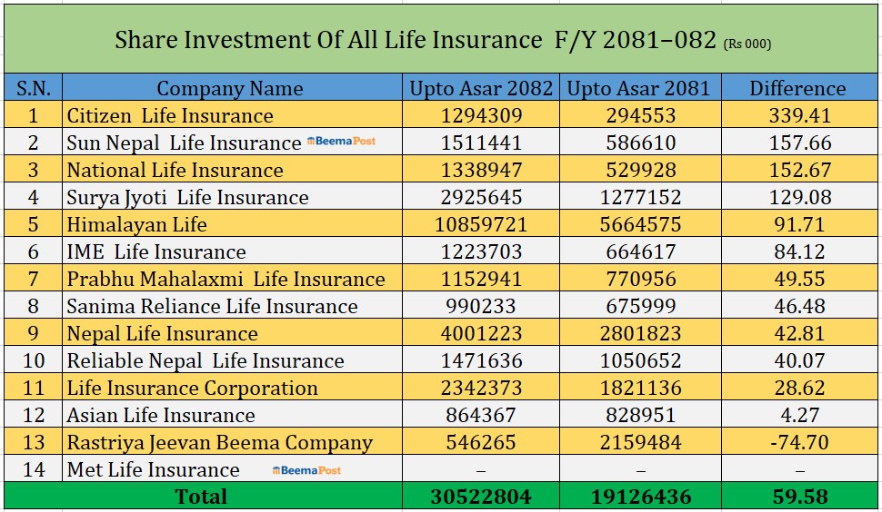 बृद्धिदरका आधारमा शेयर बजारमा लगानी सर्वाधिक लगानी बढाउने कम्पनीमा सिटिजन लाइफ अग्रस्थानमा रहेको छ । कम्पनीले दोस्रो बजारमा ३३९ प्रतिशतले लगानी बढाएको छ । सागै, सन नेपाल लाइफ इन्स्योरेन्सले १५७ प्रतिशत, नेशनल लाइफ इन्स्योरेन्सले १५२, सूर्यज्योति लाइफ इन्स्योरेन्सले १२९ प्रतिशतले लगानी बढाएका छन् ।