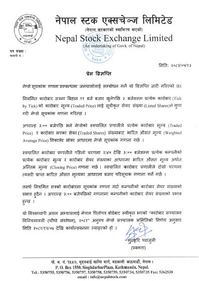 नेप्सेले जारी गरेको विज्ञप्तिमा यो अभ्यास अन्तर्राष्ट्रिय स्तरमै मान्य र उत्तम अभ्यास भएको बताउँदै नेपाल धितोपत्र बोर्डबाट स्वीकृत “कारोबार सञ्चालन विनियमावली (चौथो संशोधन), २०८१” अनुरूप सूचकाङ्क गणना प्रणाली गत वर्ष चैत ७ गतेदेखि कार्यान्वयनमा ल्याइएको जानकारी दिएको छ।