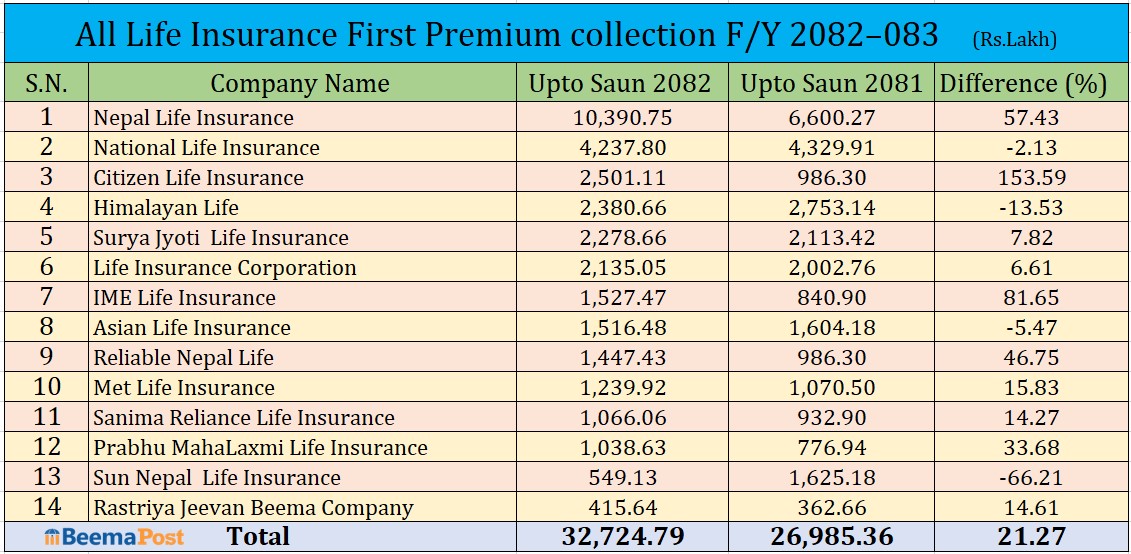 नेपाल लाइफ इन्स्योरेन्सले चालु आर्थिक वर्षको पहिलो महिनामा ५७.४३ प्रतिशतले प्रथम बीमा शुल्क आर्जन बढाएको छ । साथै, रिलायबल नेपाल लाइफ इन्स्योरेन्सको ४६.७५ प्रतिशत र प्रभु महालक्ष्मी लाइफ इन्स्योरेन्सको ३३.६८ प्रतिशतले गत आर्थिक वर्षको तुलनामा प्रथम बीमा शुल्क आर्जन बृद्धि भएको छ ।