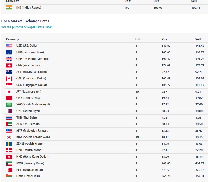 आज युके पाउन्ड स्ट्रलिङ एकको खरिदर १९० रुपैयाँ ४७ पैसा र बिक्रीदर १९१ रुपैयाँ २८ पैसा छ । स्विस र्फ्याङ्क एकको खरिददर १७६ रुपैयाँ तीन पैसा र बिक्रीदर १७६ रुपैयाँ ७८ पैसा कायम गरिएको छ । साथै, अष्ट्रेलियन डलर एकको खरिददर ९२ रुपैयाँ ३२ पैसा र बिक्रीदर ९२ रुपैयाँ ७१ पैसा तथा क्यानेडियन डलर एकको खरिदर १०२ रुपैयाँ ४८ पैसा र बिक्रीदर १०२ रुपैयाँ ९२ पैसा छ ।