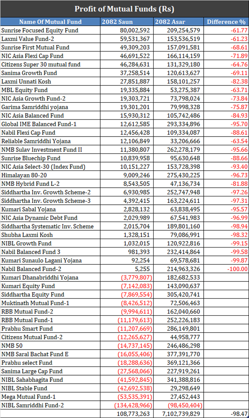 साउनमा फन्डहरुको नाफा ९८.४७ प्रतिशतले घटेर १० करोड ८७ लाख ७३ हजार रुपैयाँमा सीमित भएको छ। यो रकम गत असारसम्मको ७ अर्ब १० करोड २७ लाख ३९ हजार रुपैयाँको तुलनामा अत्यधिक कम हो।