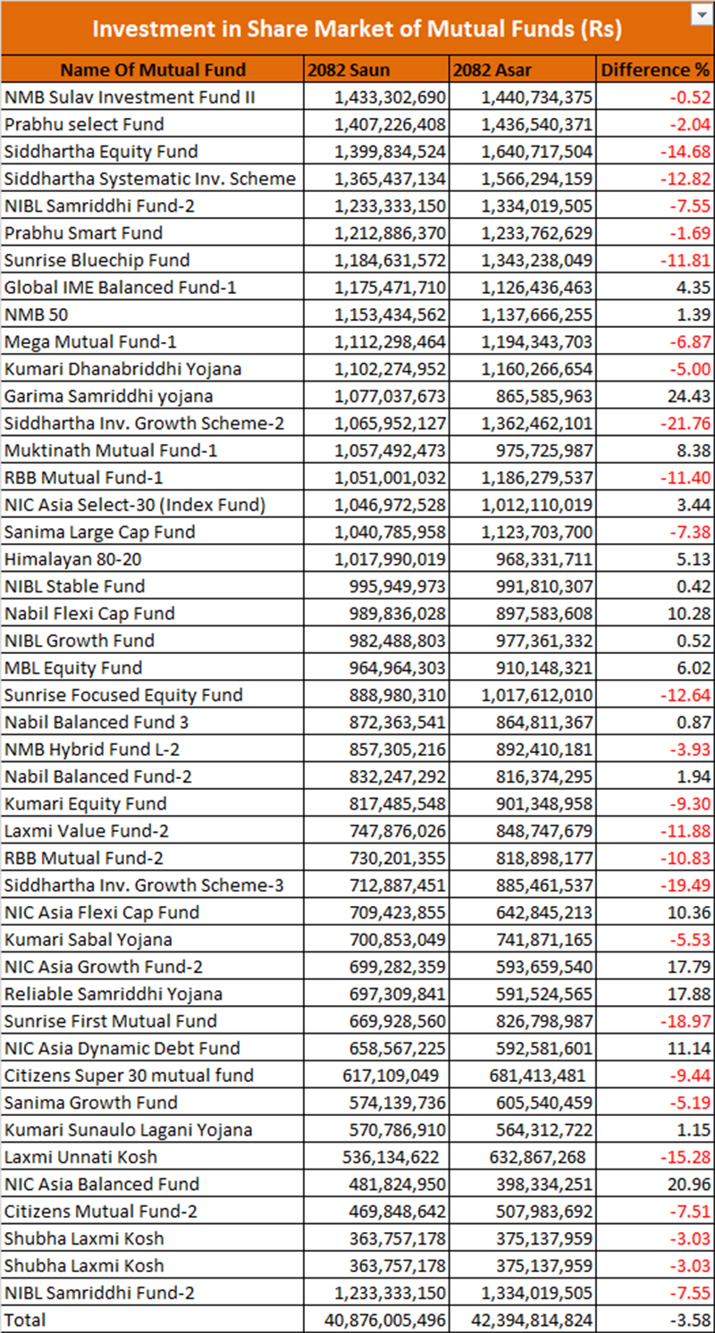 बढी लगानी भएका फन्डहरूमा गरिमा समृद्धि योजना, एनआइसी एशिया ब्यालेन्स्ड फन्ड र रिलायबल समृद्धि योजना प्रमुख छन्। यी फन्डहरूले १०–२४ प्रतिशतसम्म लगानी वृद्धि गरेका छन्। यद्यपि सिद्धार्थ इन्भेष्टमेन्ट ग्रोथ स्किम–३, सनराइज फर्सट म्युचुअल फन्ड र लक्ष्मी उन्नती फन्ड जस्ता फन्डहरूको लगानी घटेको छ।
