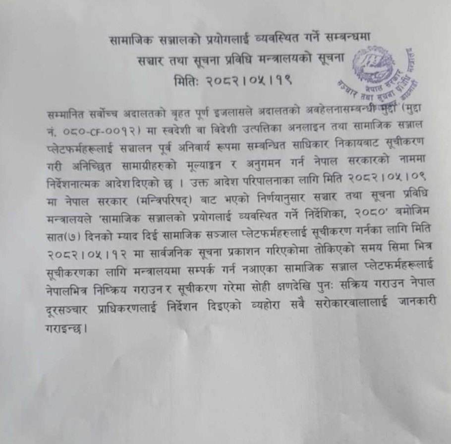 सूचीकरण नभएका सामाजिक संजाल प्लेटफर्म आजैदेखि नेपालभित्र निष्क्रिय गर्ने पत्राचार गरेको हो ।