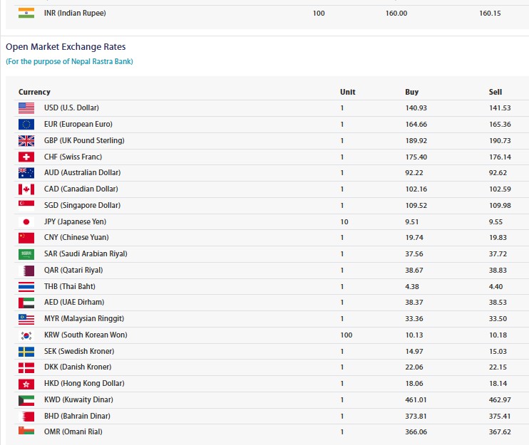 युरोपियन युरो एकको खरिददर १६४ रुपैयाँ ६६ पैसा र बिक्रीदर १६५ रुपैयाँ ३६ पैसा, युके पाउण्ड स्ट्रलिङ एकको खरिददर १८९ रुपैयाँ ९२ पैसा र बिक्रीदर १९० रुपैयाँ ७३ पैसा, स्वीस फ्रयाङ्क एकको खरिददर १७५ रुपैयाँ ४० पैसा र बिक्रीदर १७६ रुपैयाँ १४ पैसा कायम गरिएको छ ।