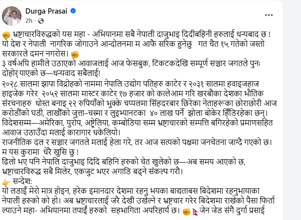 जेन जि पुस्ताको आन्दोलनलाई दुर्गा प्रसाईको साथ