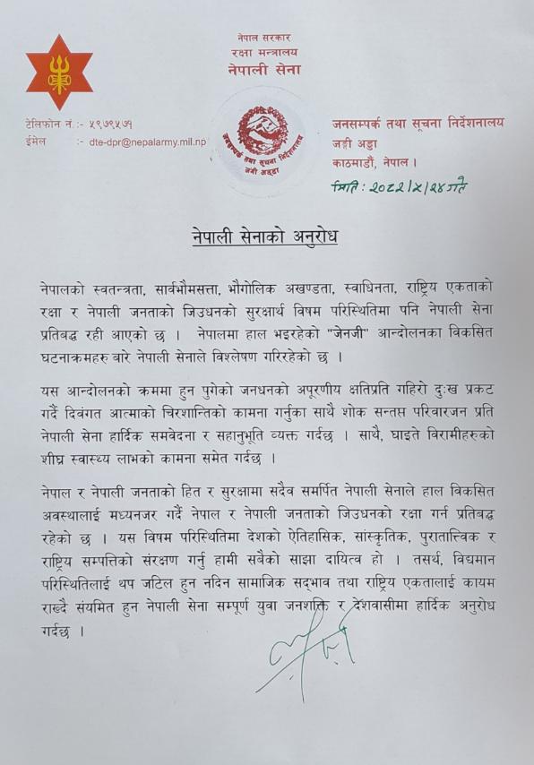 साथै, सेनाले हाल विकसित अवस्थाले राष्ट्रिय सम्पत्ति, ऐतिहासिक तथा सांस्कृतिक धरोहरलाई क्षति पुर्याउन नदिन आग्रह गर्दै भनेको छ, ‘देशको हित र सुरक्षामा सदैव समर्पित नेपाली सेनाले सम्पूर्ण युवा जनशक्ति र देशवासीलाई सामाजिक सद्भाव र राष्ट्रिय एकतालाई कायम राख्दै संयमित रहन हार्दिक अनुरोध गर्दछ।’