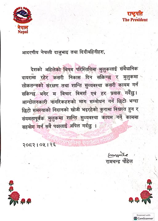 काठमाडौं । राष्ट्रपति रामचन्द्र पौडेलले मुलुकको वर्तमान विषम परिस्थितिमा सबै पक्षलाई संयमतापूर्वक काम गर्न अपिल गरेका छन्।