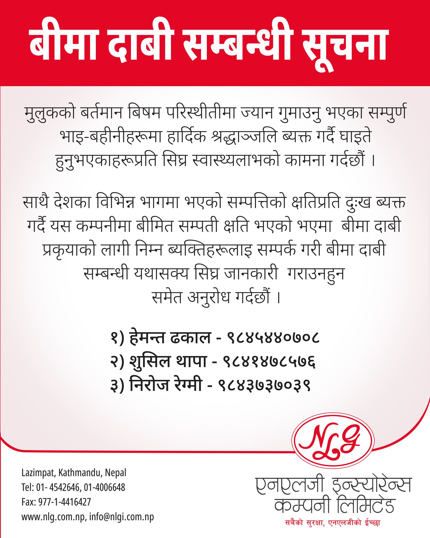 जेनजी आन्दोलनमा क्षति भएको सम्पत्तिको बीमा दावी सहज बनाउने एनएलजी इन्स्योरेन्सको प्रतिबद्दता, कर्मचारीलाई सम्पर्क गर्न आग्रह