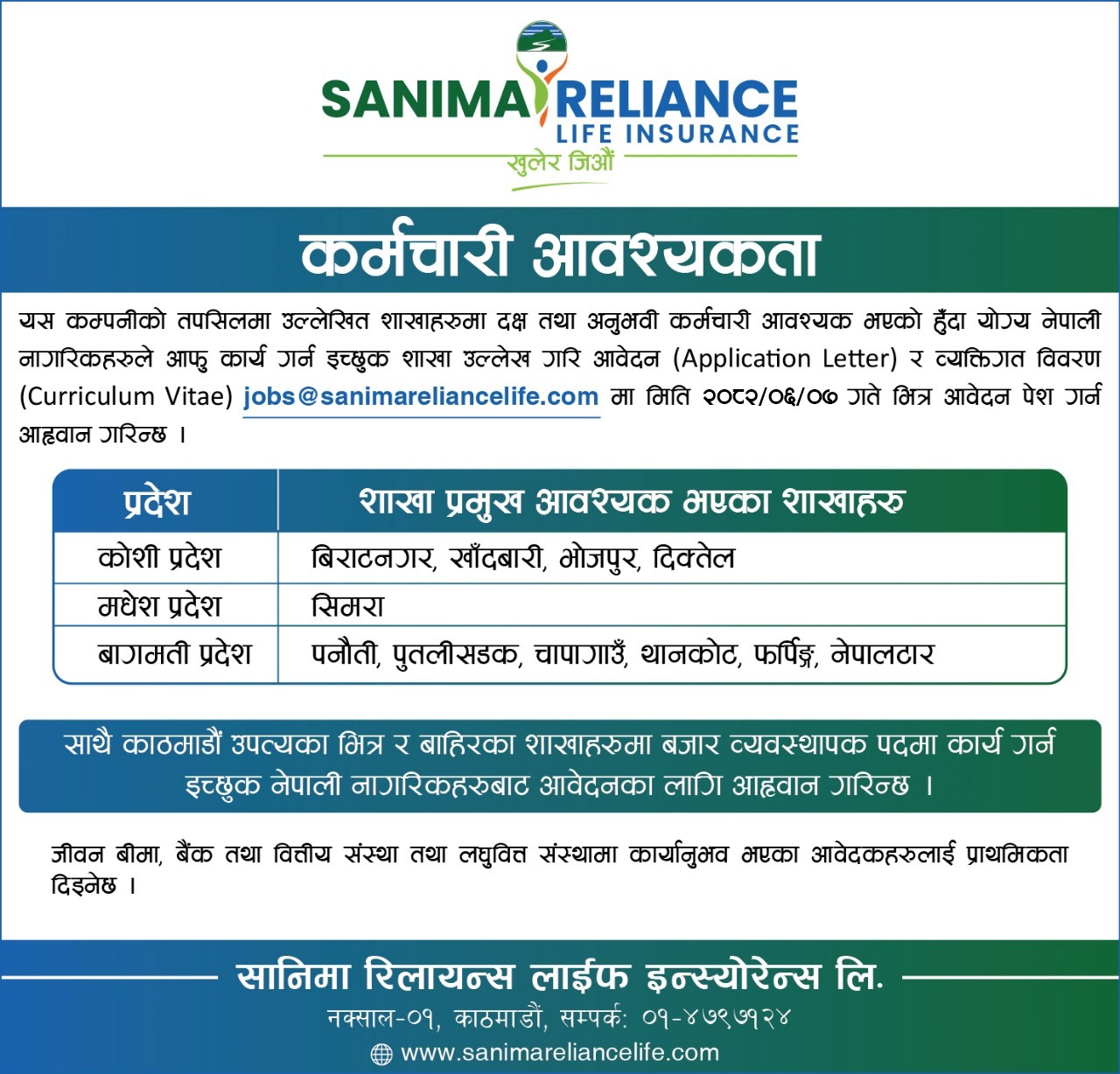 सानिमा रिलायन्स लाइफद्वारा कर्मचारी माग, कसरी दिने आवेदन ?