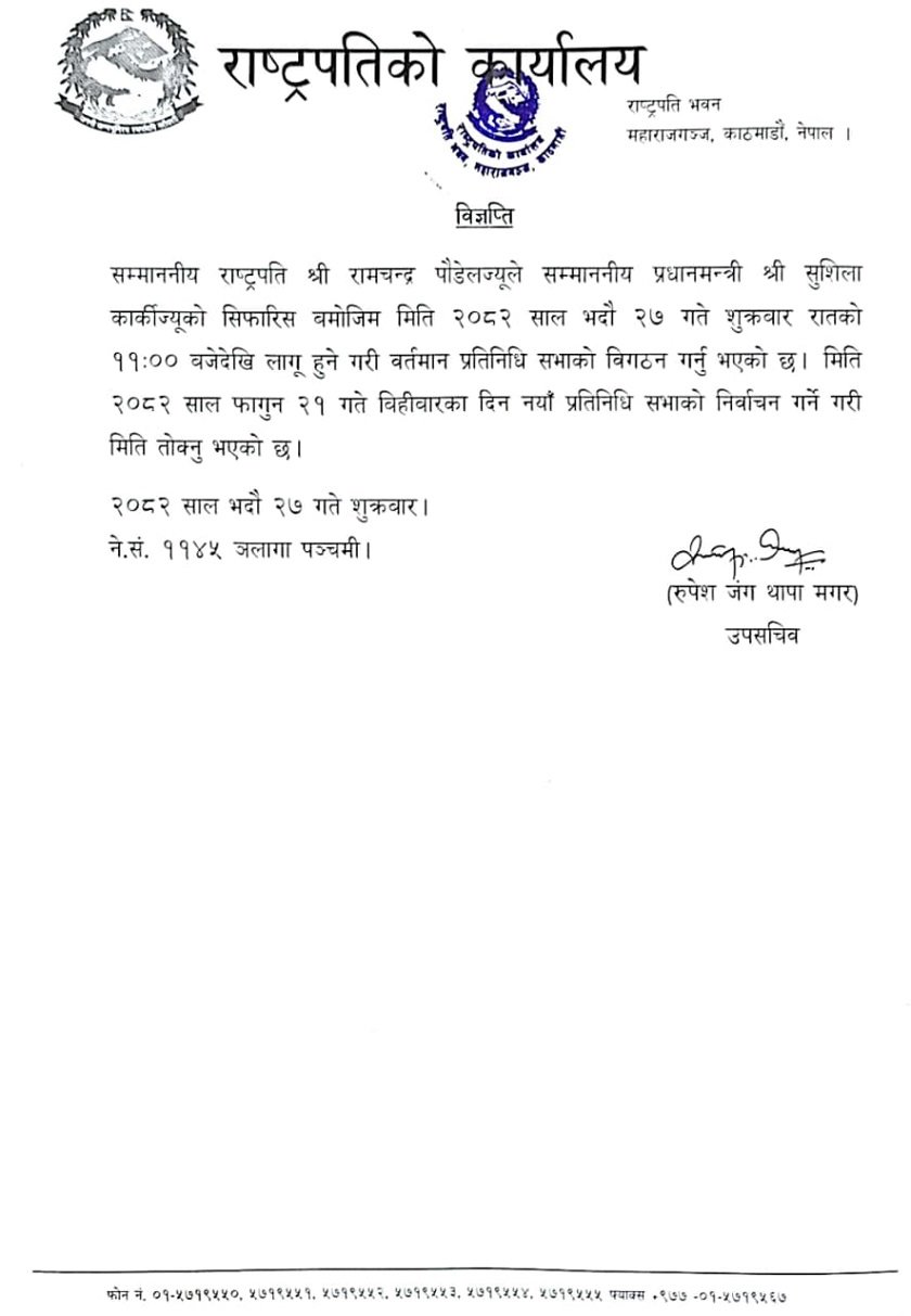 काठमार्डौं । राष्ट्रपति रामचन्द्र पौडेलले प्रतिनिधिसभा विघटन गर्ने निर्णय गरेका छन् । नवनियुक्त प्रधानमन्त्री सुशीला कार्कीको सिफारिसका आधारमा राष्ट्रपति पौडेलले प्रतिनिधिसभा विघटन गर्ने निर्णय गरेका हुन् ।