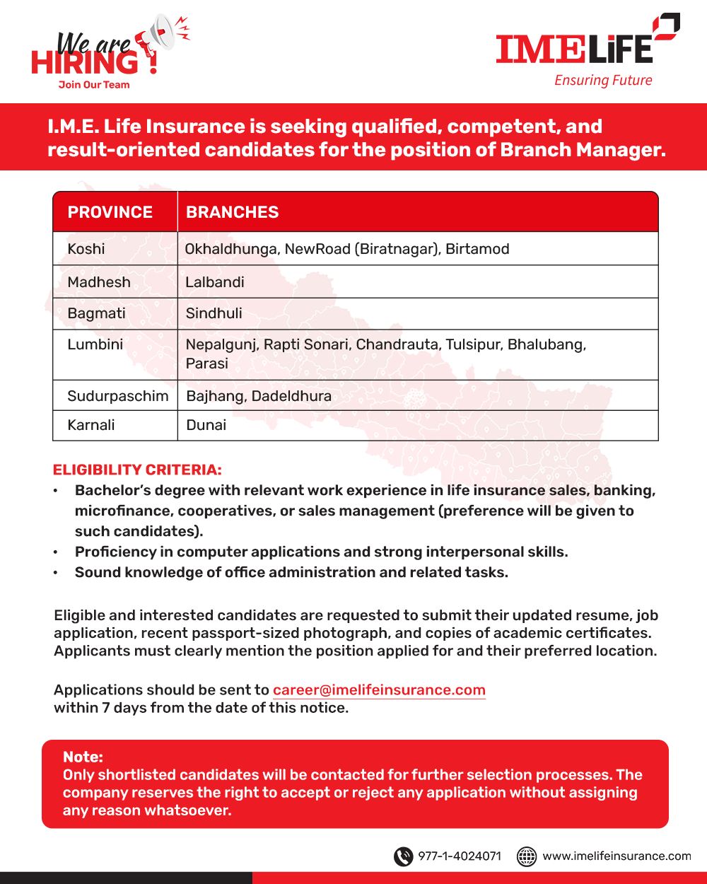 कम्पनीले ओखलढुङ्गा, विराटनगर, बिर्तामोड, लालबन्दी, सिन्धुली, नेपालगंज, राप्ती सोनारी, तुलसीपुर, भालुबाङ, बझाङ, डडेल्धुरा लगायतका ब्रान्चको लागि शाखा प्रमुख माग गरेको छ । उक्त पदमा आवेदन दिनको लागि उम्मेद्वारहरुले मान्यताप्राप्त शैक्षिक संस्थाबाट स्नातक तह उत्तिर्ण गरेको हुनुपर्ने छ ।