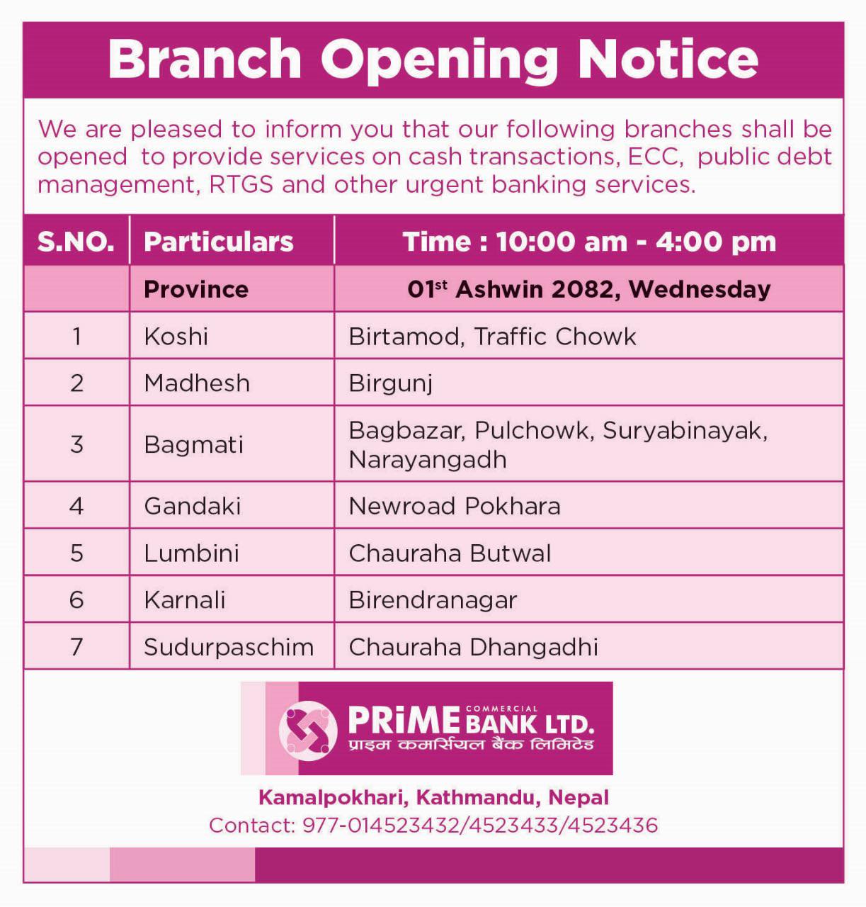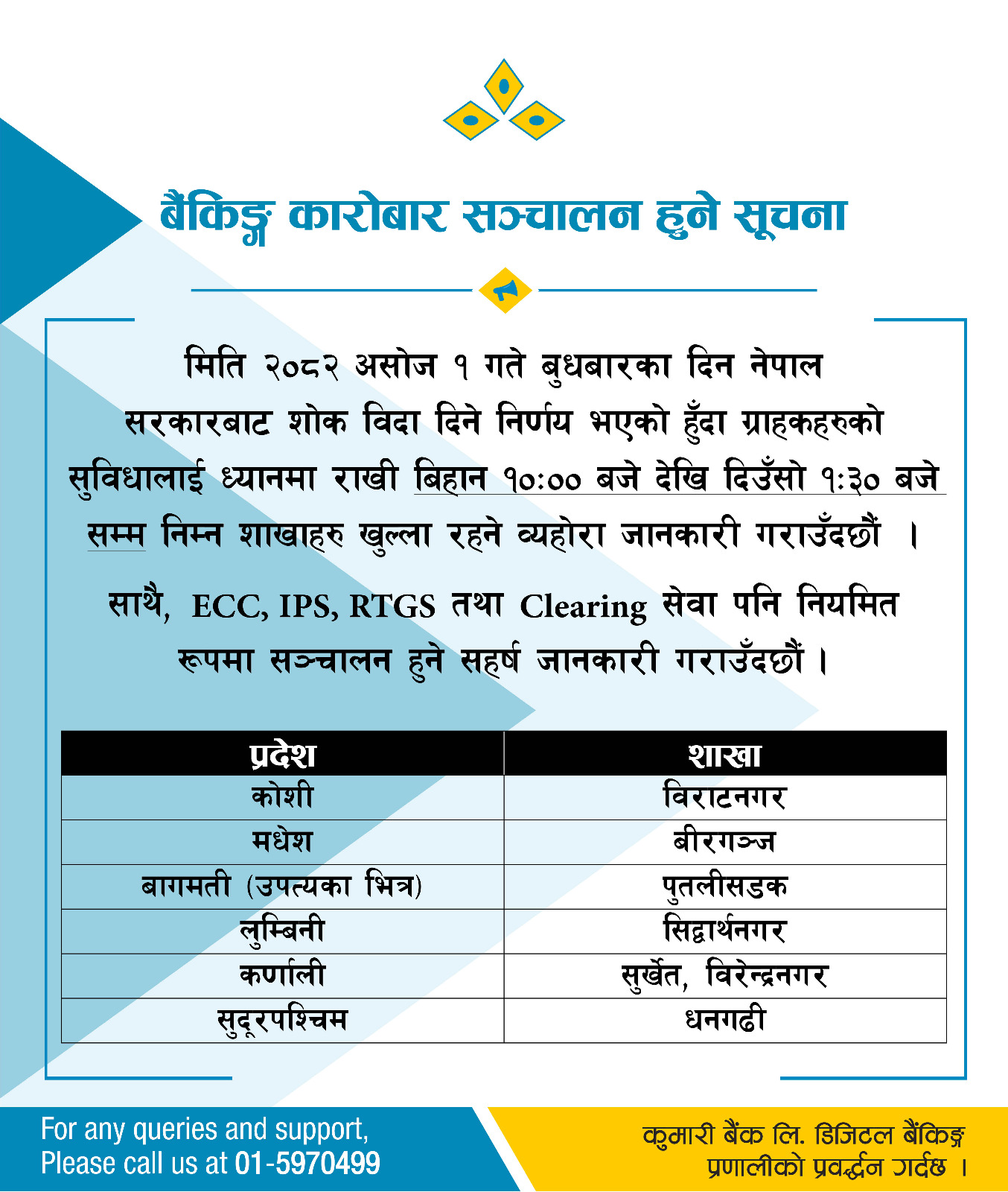 बैंकहरुले आफ्ना ग्राहकलाई नियमित सेवा प्रवाहमा अवरोध नहोस् भन्ने उद्देश्यले बिदाको दिनमा समेत शाखा सञ्चालन गर्ने भएका हुन्। केही बैंकहरुले आफ्ना शाखा तथा काउन्टर खुला रहने सूचना सामाजिक सञ्जाल र वेबसाइटमार्फत सार्वजनिक गरिसकेका छन्।