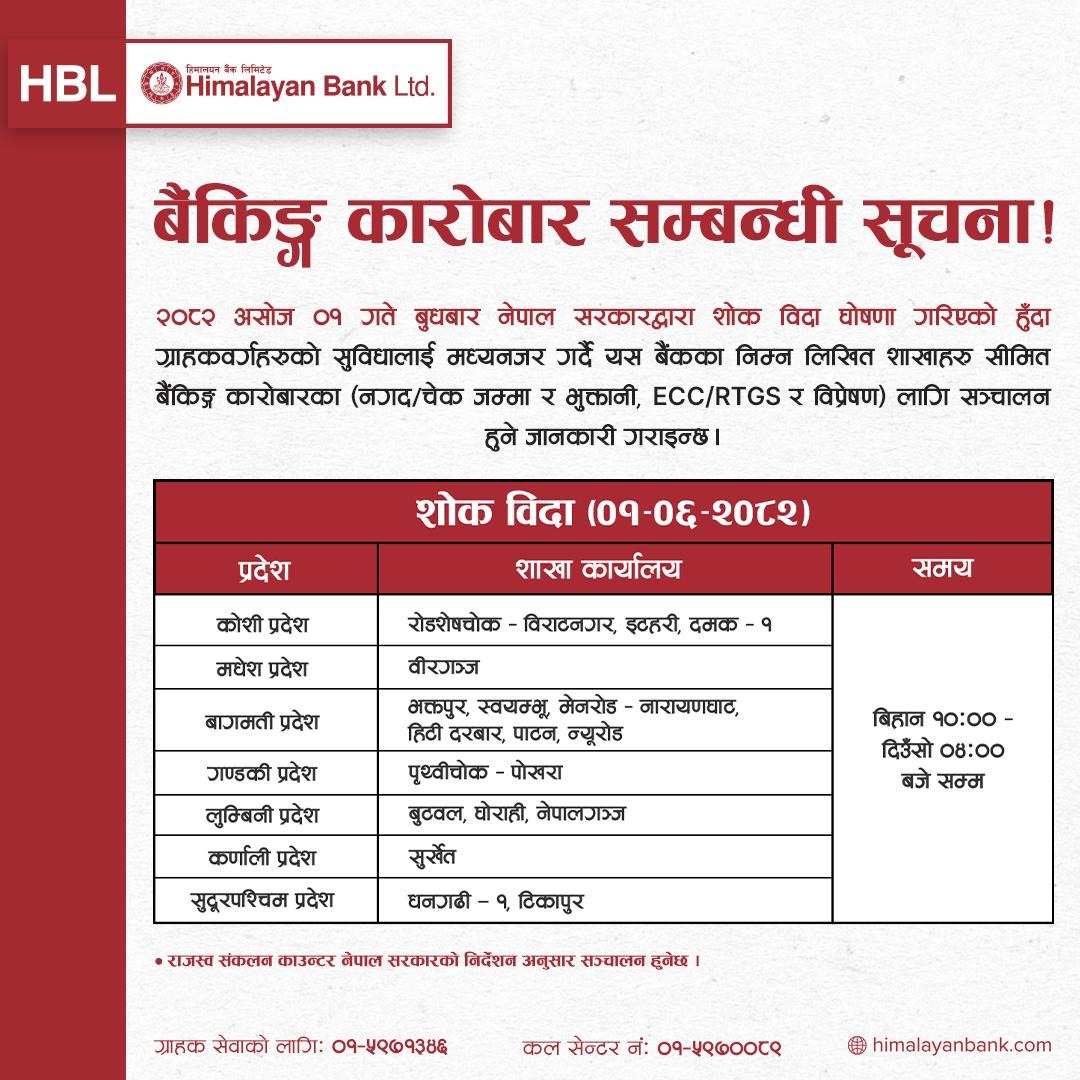 काठमाडौँ । सरकारले जेन जी आन्दोलनका क्रममा शाहादत प्राप्त गरेकाहरुको सम्मानमा आज देशभर शोक बिदा दिइएको भए पनि अधिकांश बैंकहरुले आफ्ना शाखामार्फत सेवा सञ्चालन गर्ने भएका छन्। बिदा दिने निर्णय गरे पनि वाणिज्य बैंक तथा विकास बैंकहरूले ग्राहक सुविधालाई मध्यनजर गर्दै केहि शाखा खुला राख्ने निर्णय गरेका हुन्।