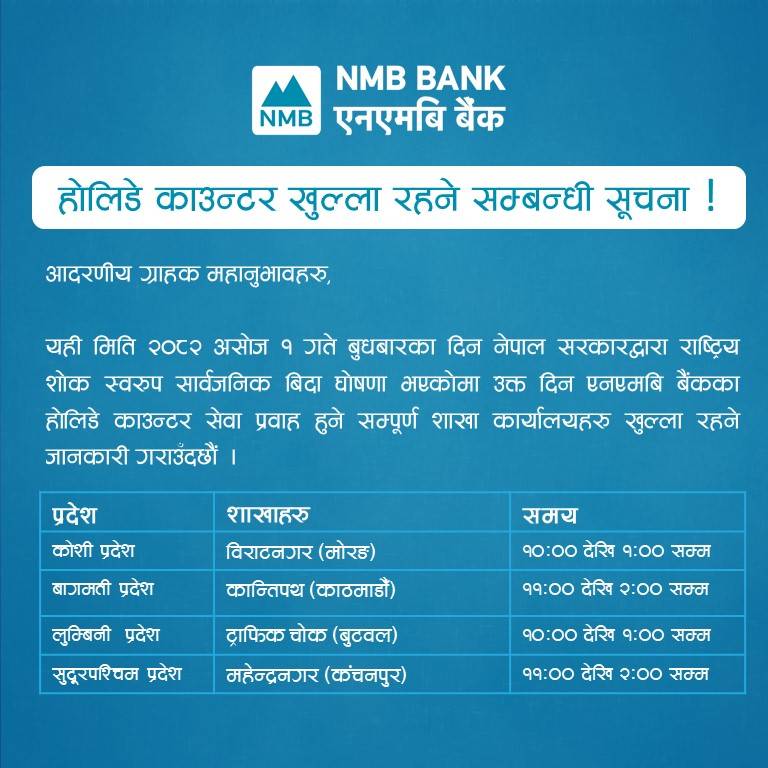 बैंकहरुले आफ्ना ग्राहकलाई नियमित सेवा प्रवाहमा अवरोध नहोस् भन्ने उद्देश्यले बिदाको दिनमा समेत शाखा सञ्चालन गर्ने भएका हुन्। केही बैंकहरुले आफ्ना शाखा तथा काउन्टर खुला रहने सूचना सामाजिक सञ्जाल र वेबसाइटमार्फत सार्वजनिक गरिसकेका छन्।
