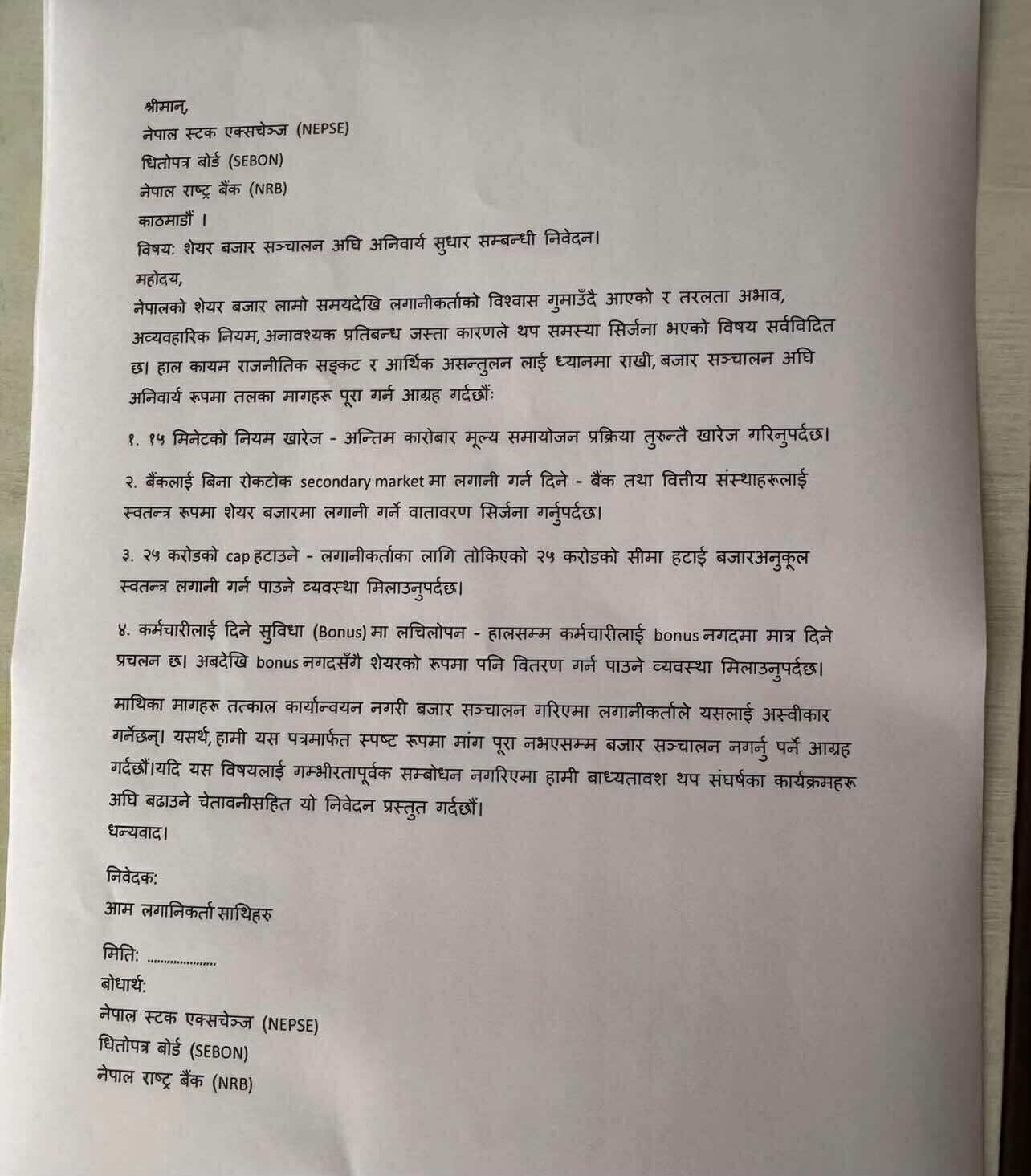 लगानीकर्ताले माथि उल्लेखित मागहरू तत्काल कार्यान्वयन नगरी बजार सञ्चालन गरिएमा अस्वीकार गर्ने चेतावनी दिएका छन्।