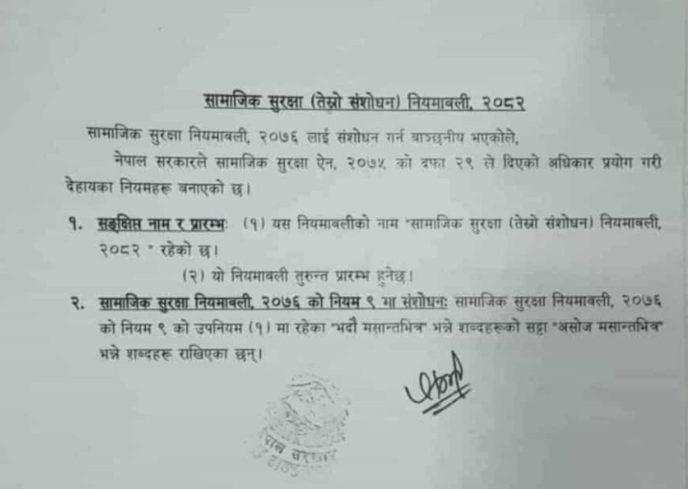 तर, गृह मन्त्रालयले उक्त नियमलाई संशोधन गर्दै ‘साउन मसान्तभित्र’ भन्ने शब्दलाई ‘असोज मसान्तभित्र’मा परिवर्तन गरेको छ। यससँगै लाभार्थीहरूले अब असोज मसान्तसम्म सामाजिक सुरक्षा परिचयपत्र नवीकरण गर्न सक्ने भएका छन्।