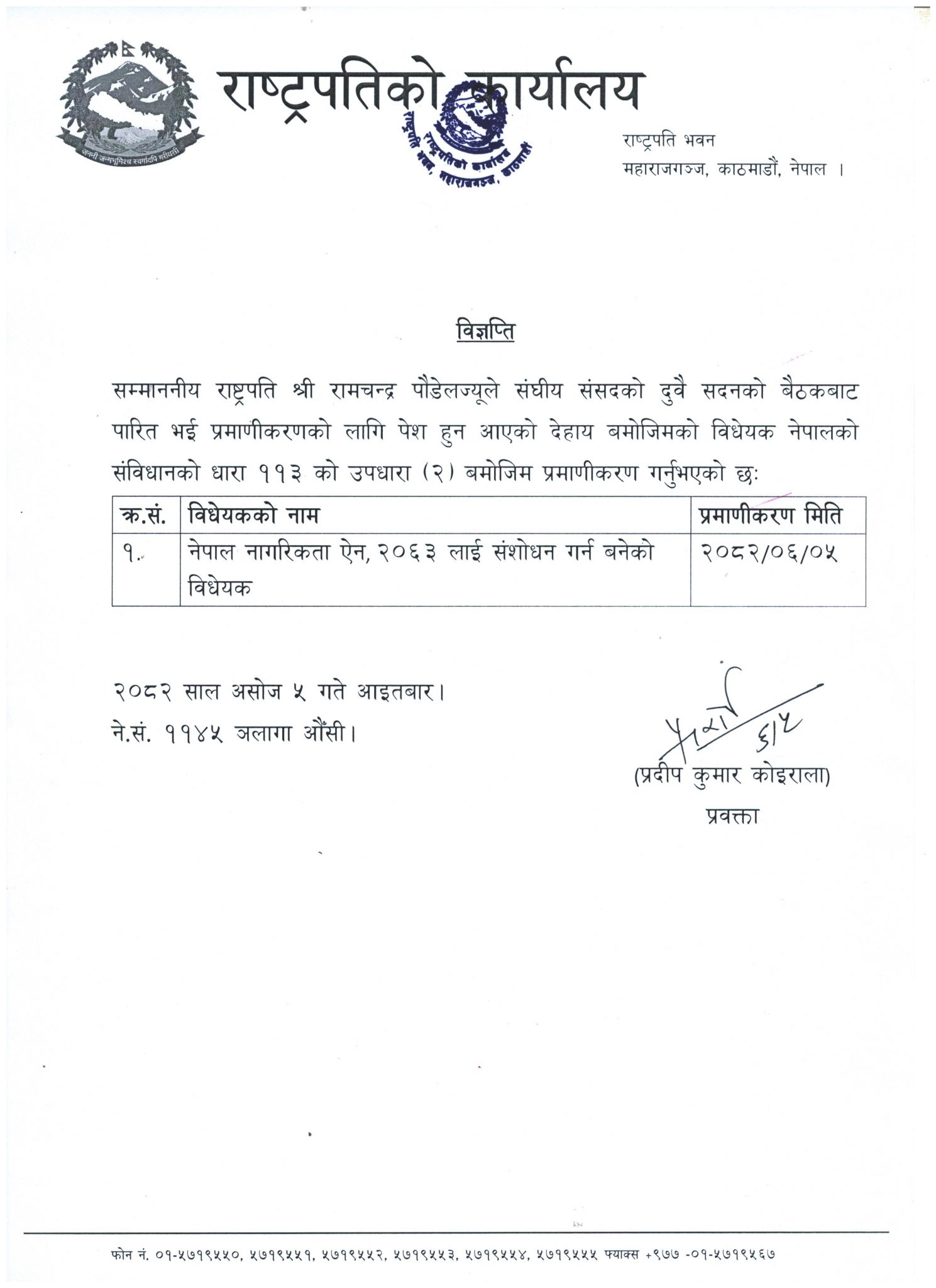 संघीय संसदको दुवै सदनबाट पारित भई प्रमाणीकरणको लागि पेश भएको उक्त विधेयक पौडेलले आज प्रमाणीकरण गरेका हुन् ।