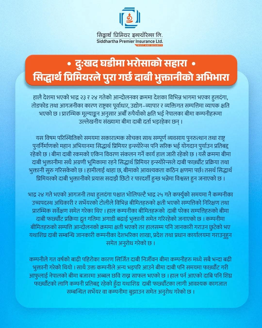 ‘दुःखद घडीमा भरोसाको सहारा–सिद्धार्थ प्रिमियरले पुरा गर्छ दाबी भुक्तानीको अभिभारा’