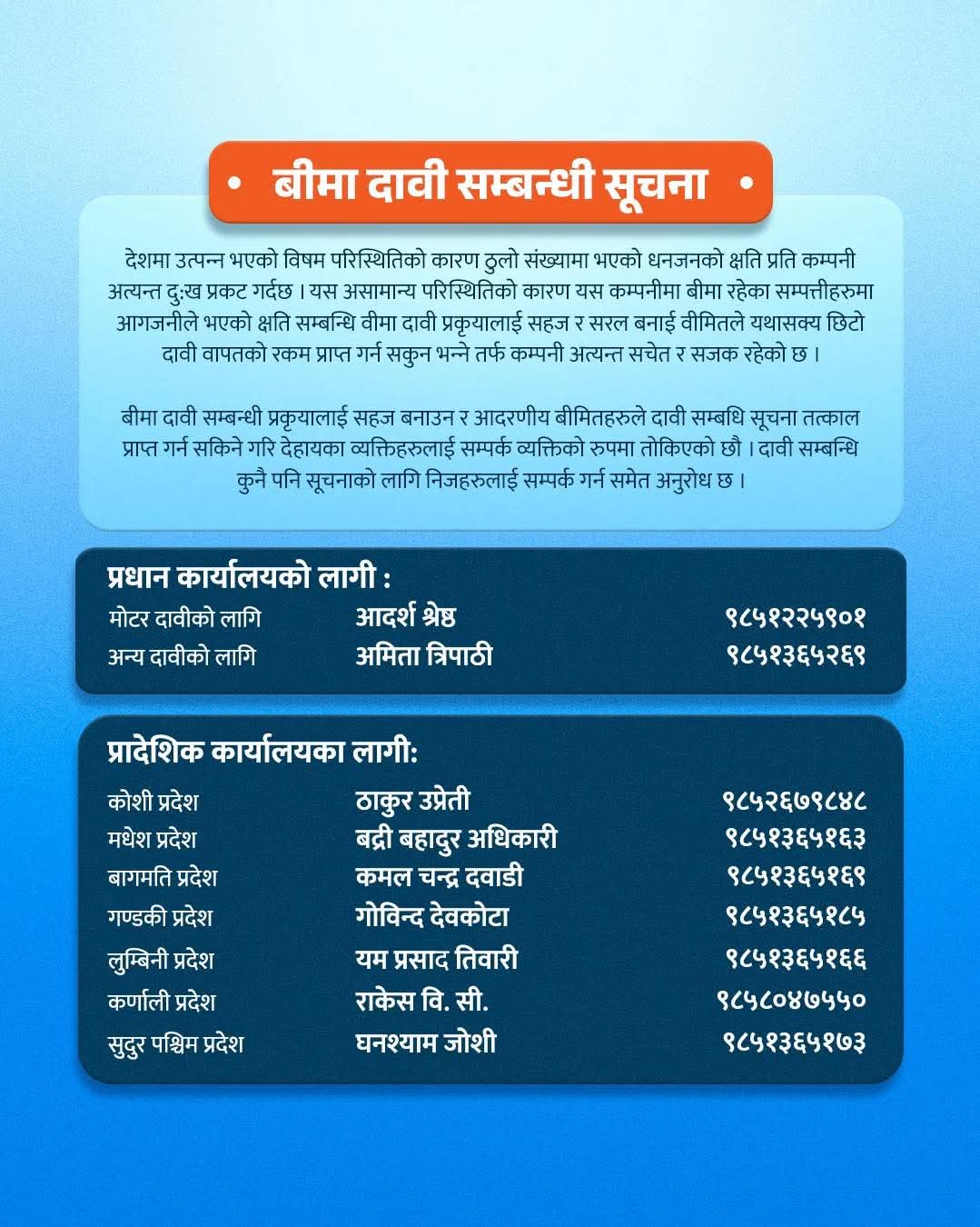 हाल पर्न आएको दाबि पनि शिघ्र फर्छ्यौटको लागि कम्पनी प्रतिबद्द रहेको हुँदा यथाशिग्र दाबी फर्छ्यौटका लागी आवश्यक कागजात सम्बन्धित सर्भेयर वा कम्पनीमा बुझाउन समेत अनुरोध गरेको छ ।