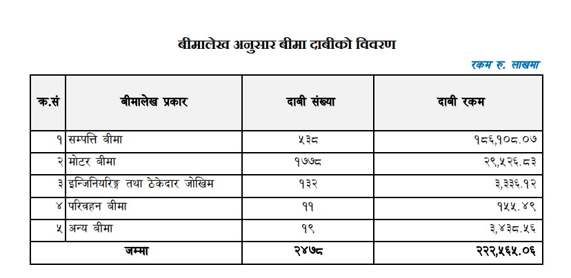 हालसम्म परेको प्रारम्भिक बीमा दावीमध्ये सम्पत्ति बीमालेखमा सबैभन्दा बढी रुपैयाँको बीमा दावी परेको छ । जेन–जी आन्दोलनकारीले सबैभन्दा बढी नागरीक र सरकारी सम्पत्तिमा क्षति पुर्याएका कारण सम्पत्ति बीमामा सर्वाधिक दावी परेको हो । सम्पत्ति बीमामा असोज ५ गतेसम्म कुल ५३८ वटा दावी बापत १८ अर्ब ६१ करोड आठ लाख रुपैयाँको प्रारम्भिक बीमा दावी परेको छ । समग्र दावीको ८३ प्रतिशत यसमा परेको छ ।