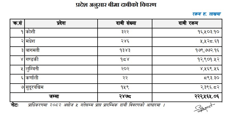 साथै, कोशी प्रदेशमा एक अर्ब ६५ करोड तीन लाख रुपैयाँ, गण्डकी प्रदेशमा एक अर्ब २९ करोड एक लाख रुपैयाँ, मधेश प्रदेशमा ५५ करोड २८ लाख रुपैयाँ, लुम्बिनी प्रदेशमा ४५ करोड ६९ लाख रुपैयाँ, सुदूरपश्चिम प्रदेशमा २३ करोड ९६ लाख रुपैयाँ र कर्णाली प्रदेशमा आठ करोड ९३ लाख रुपैयाँको प्रारम्भिक बीमा दावी परेको छ ।