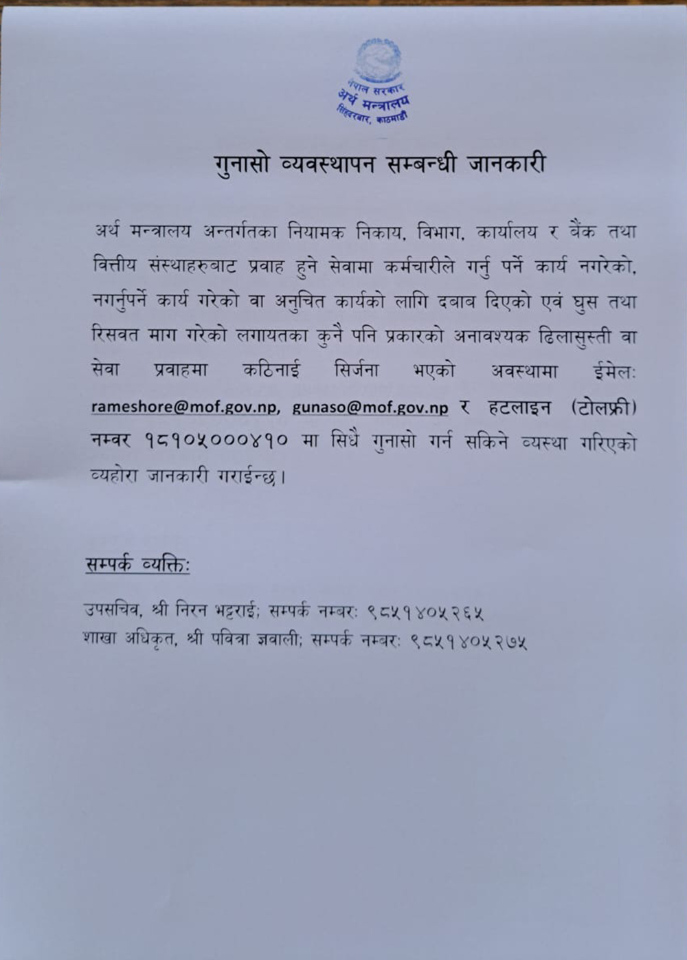मन्त्रालयले जारी गरेको सूचनाअनुसार नियामक निकाय, विभाग, कार्यालय तथा बैंक तथा वित्तीय संस्थासँग सम्बन्धित सेवा प्रवाहमा कर्मचारीहरूले गर्नुपर्ने काम नगरेको, अनुचित दबाब दिएको वा घुस–रिसवत मागेको अवस्थामा तत्काल गुनासो गर्न सकिने व्यवस्था गरिएको हो ।