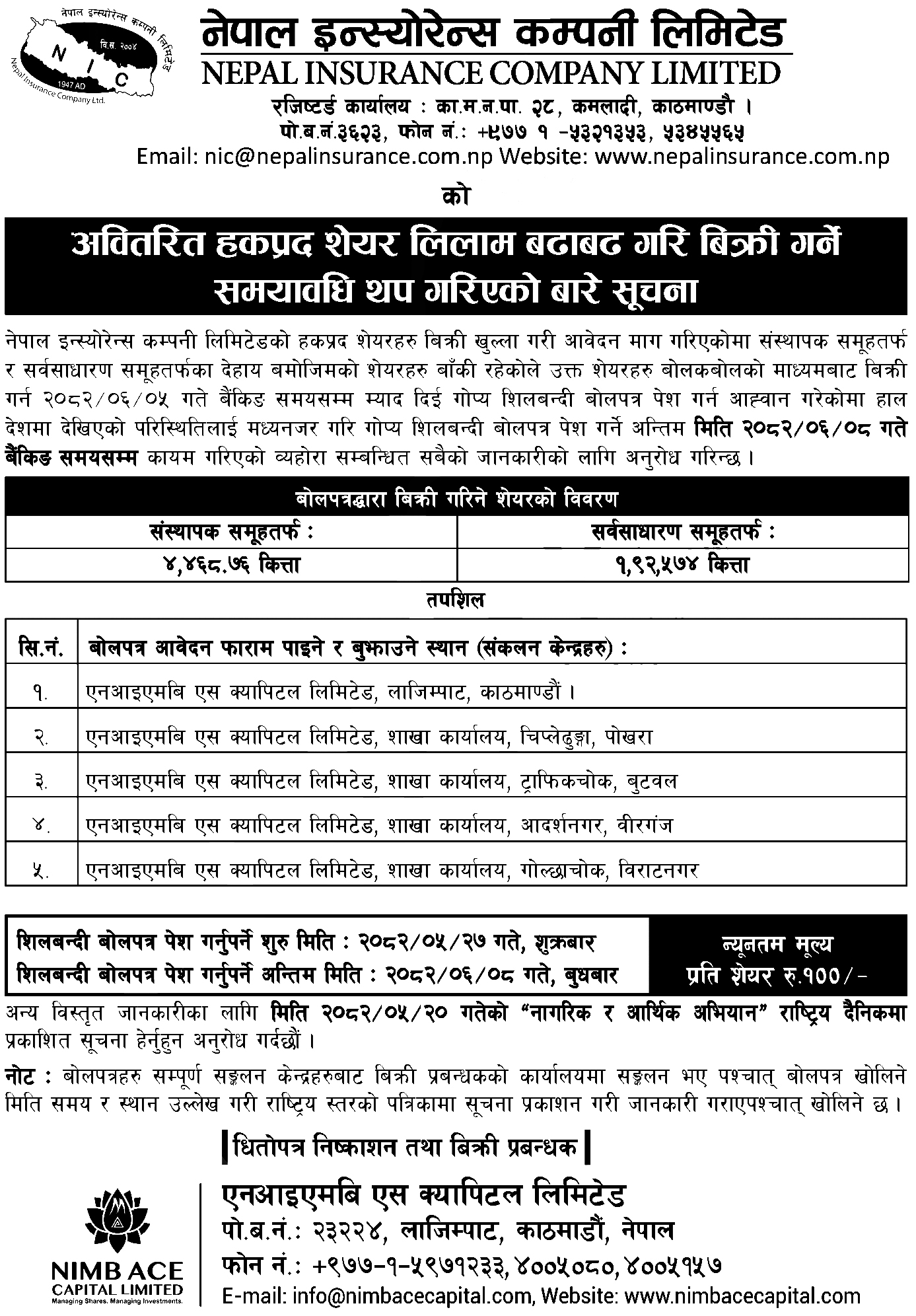 यसमा बोलपत्र पेश गर्दा संस्थापकतर्फ कम्तीमा १ हजार कित्ता र सर्वसाधारणतर्फ १०० कित्ता माग गर्नुपर्नेछ भने बढीमा सम्पूर्ण कित्ता माग गर्न सकिने कम्पनीले जनाएको छ।