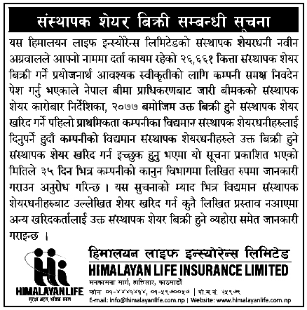 काठमाडौं । हिमालयन लाइफ इन्स्योरेन्स लिमिटेडले संस्थापक शेयरधनी नवीन अग्रवालको नाममा रहेको २६ हजार ६६१ कित्ता संस्थापक शेयर बिक्रीमा राखेको छ।