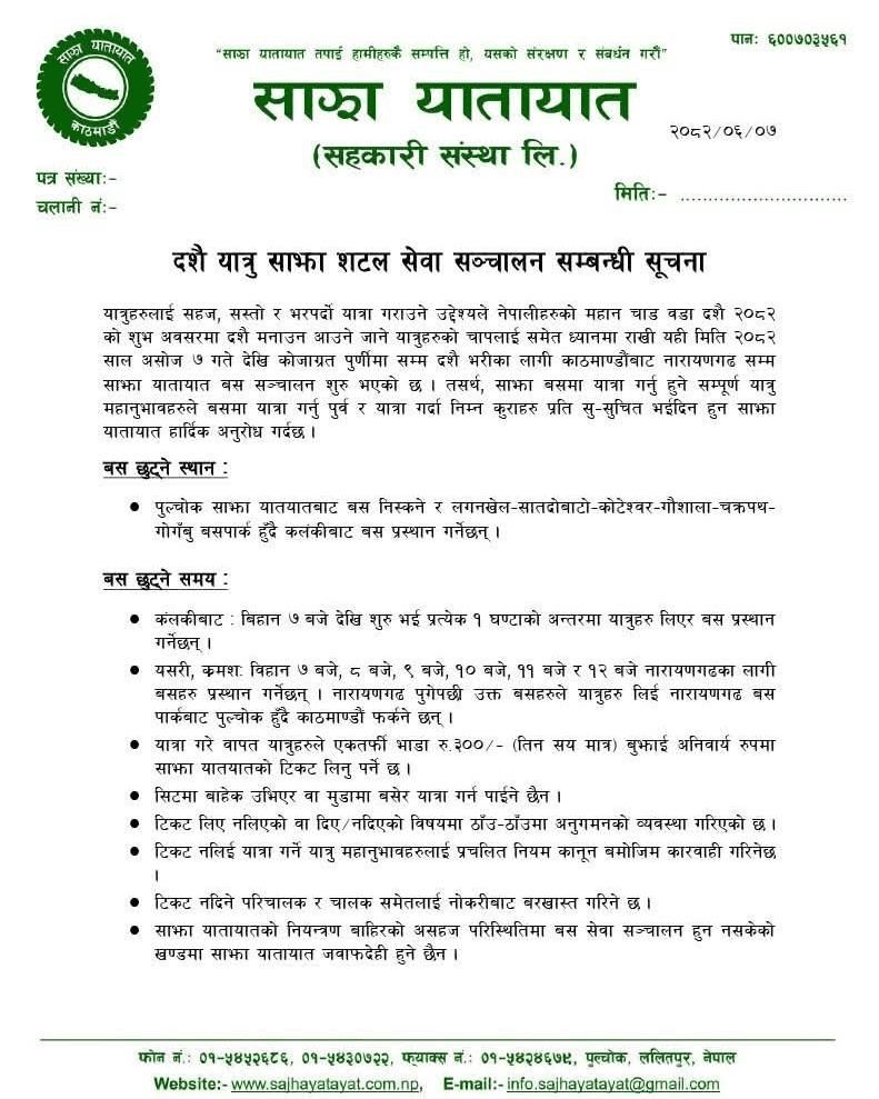 काठमाडौं । साझा यातायात सहकारी संस्था लिमिटेडले असोज ७ देखि २१ गतेसम्म काठमाडौंदेखि नारायणगढसम्म बस सञ्चालनमा ल्याएको छ। दशैंमा यात्रुको चाप बढी हुने भएकाले सहज र सस्तो सेवा दिने उद्देश्यले उक्त रुटमा बस सञ्चालन गरिएको यातायातले जनाएको छ।
