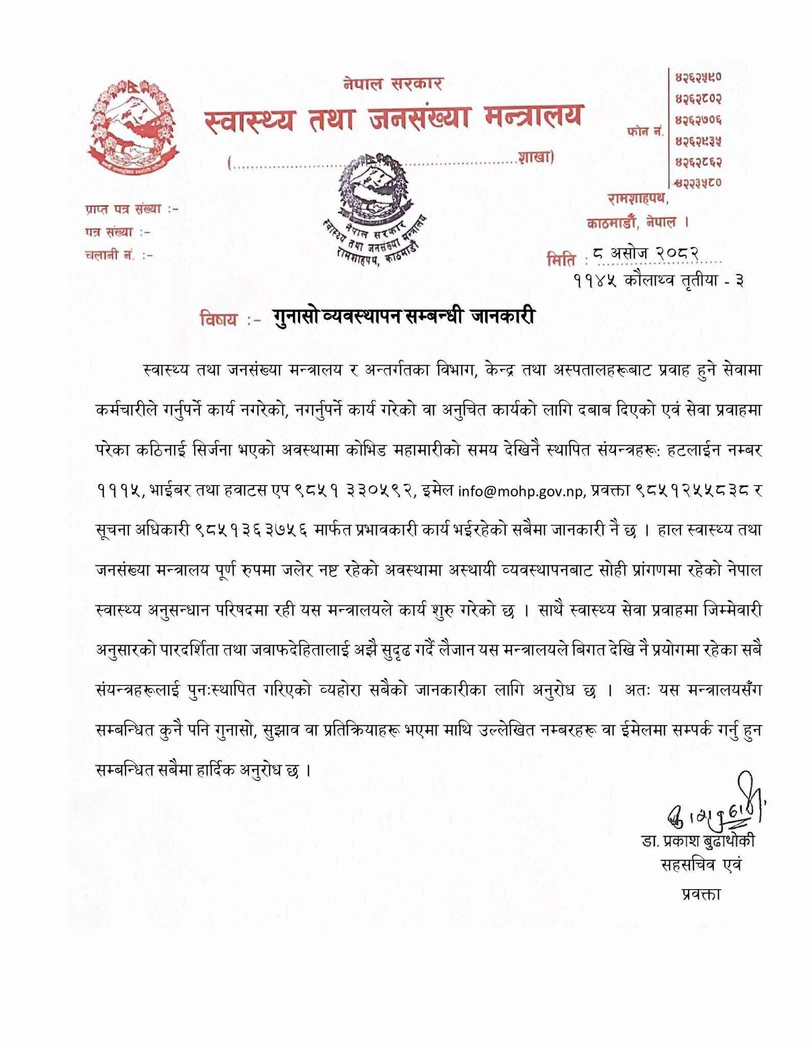काठमाडौं । स्वास्थ्य तथा जनसंख्या मन्त्रालयले गुनासो व्यवस्थापन प्रणाली पुनः सक्रिय गरेको जनाएको छ।