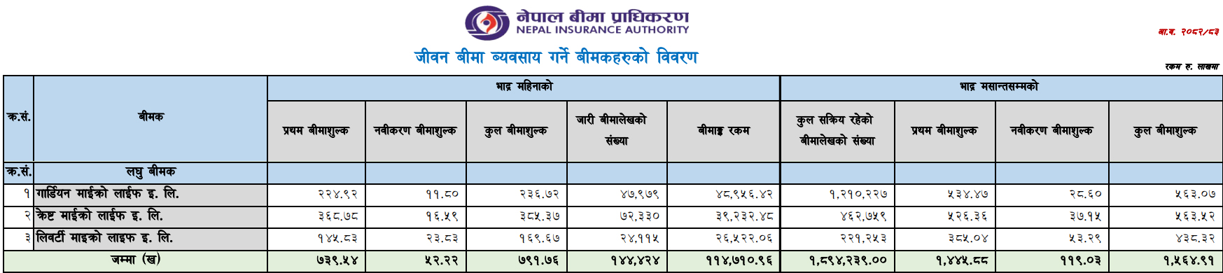 भदौ महीनाको मात्रै तथ्यांक हेर्ने हो भने क्रेष्ट माइक्रो लाइफले सर्वाधिक ३ करोड ८५ लाख ३७ हजार रुपैयाँ, दोस्रोमा गार्डियन माइक्रो लाइफले २ करोड ३६ लाख ७२ हजार रुपैयाँ र लिवर्टी माइक्रो लाइफले १ करोड ६९ लाख ६७ हजार रुपैयाँ कुल बीमाशुल्क आर्जन गरेका छन्।