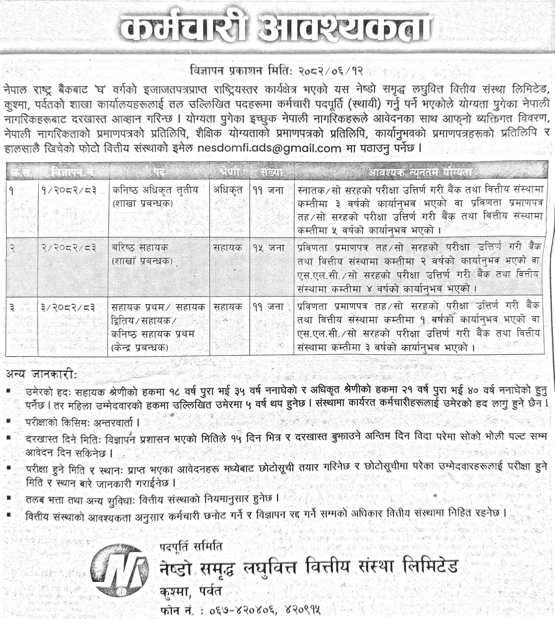 नेष्डो समृद्ध लघुवित्तले माग्यो ठूलो संख्यामा कर्मचारी, कति चाहिन्छ योग्यता?