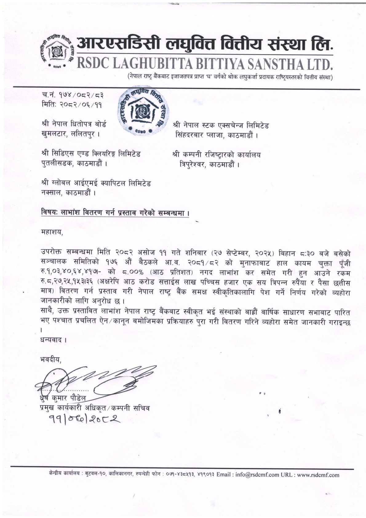 कम्पनीको असोज ११ गते बसेको सञ्चालक समितिको बैठकले शेयरधनीलाई हाल कायम चुक्ता पूँजीको ८ प्रतिशत नगद लाभांश (कर समेत) वितरण गर्ने निर्णय गरेको हो।