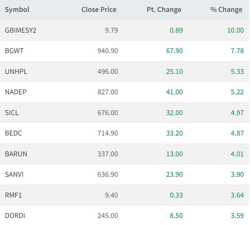 त्यस्तै नाडेप लघुवित्तको ५.२२ प्रतिशत, शिखर इन्स्योरेन्सको ४.९७ प्रतिशत, भुगोल इनर्जीको ४.८७ प्रतिशत, बरुण हाइड्रोपावरको ४.०१ प्रतिशत, सान्भी इनजीको ३.९० प्रतिशत, आरबीबी म्युचुअल फण्ड १ को ३.६४ प्रतिशत र दोर्दी खोलाको ३.५९ प्रतिशतले शेयरमूल्य बढेको छ।