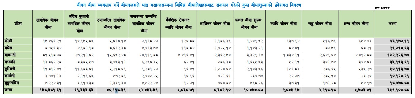 नेपाल बीमा प्राधिकरणले प्रकाशित गरेको वित्तीय विवरण अनुसार साउन महिनामा नेपालमा हाल सञ्चालन रहेका १४ वटा जीवन बीमा र ३ वटा लघु जीवन बीमा कम्पनीहरुले १० प्रकारका बीमा पोलिसीहरु बिक्री गरेर उक्त व्यवसाय गरेका हुन् ।