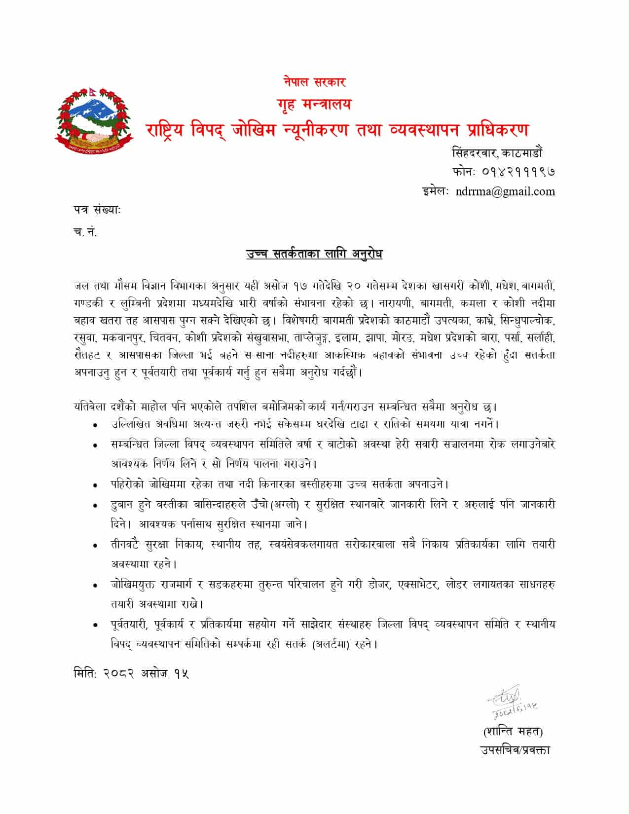 ‘बागमती प्रदेशको काठमाडौँ उपत्यका, काभ्रे, सिन्धुपाल्चोक, रसुवा, मकवानपुर, चितवन, कोशी प्रदेशको सङ्खुवासभा, ताप्लेजुङ, इलाम, झापा, मोरङ, मधेस प्रदेशको बारा, पर्सा, सर्लाही, रौतहट लगायतका जिल्लामा आकस्मिक बहाव र डुबानको जोखिम उच्च छ, त्यसैले सतर्कता अपनाउन सबैमा अनुरोध गर्दछौँ,’ प्राधिकरणले जारी गरेको सूचनामा भनिएको छ ।