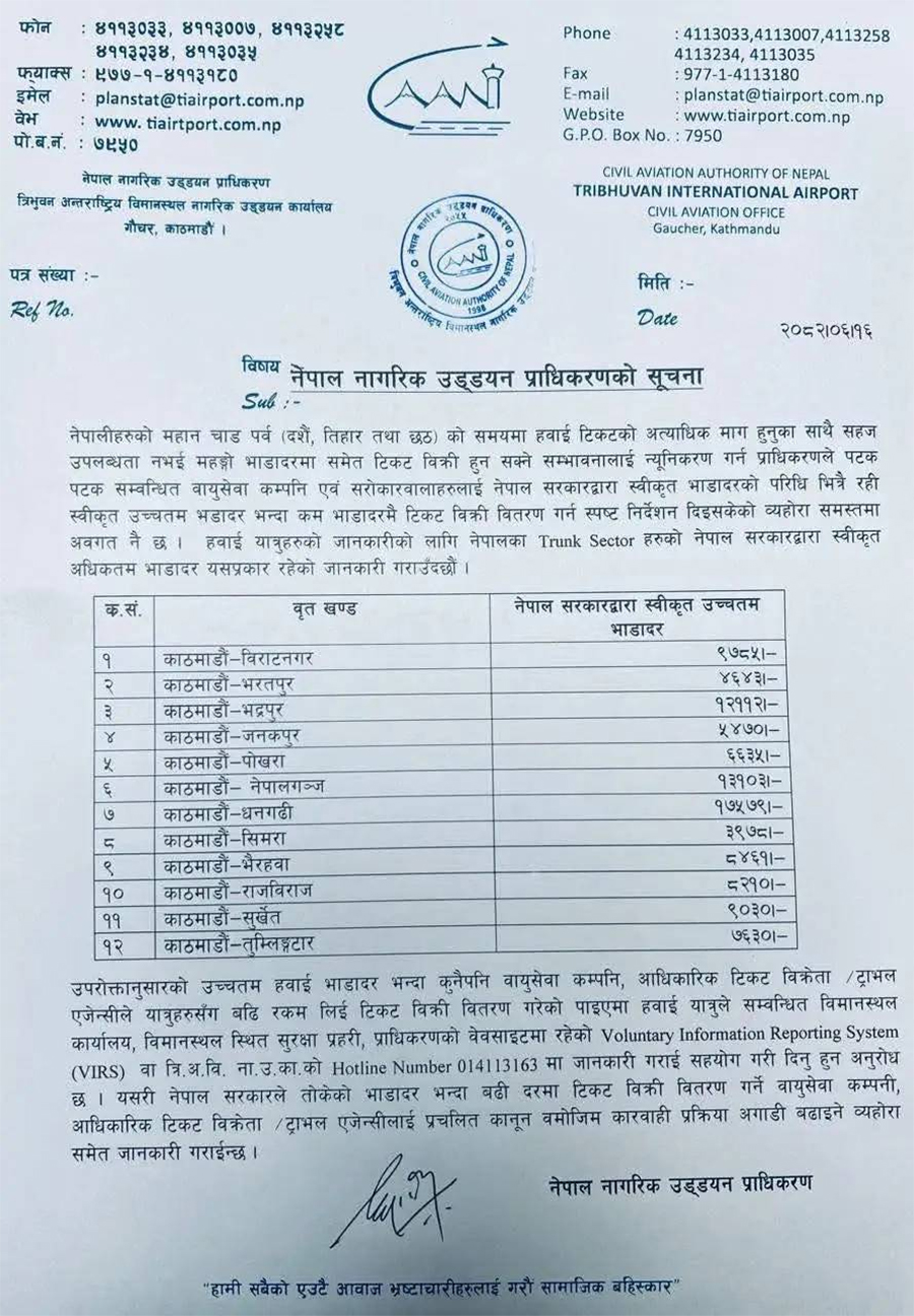 नेपाल सरकारबाट स्वीकृत तोकिएको अधिकतम भाडादरभन्दा बढी रकम यात्रुहरुबाट नलिन पनि प्राधिकरणले वायु सेवा कम्पनी र सरोकारवालाई निर्देशन दिइसकेको जनाएको छ । यदि तोकिएको भन्दा बढी भाडा लिएमा कारबाही गर्ने चेतावनी पनि प्राधिकरणले दिएको छ ।
