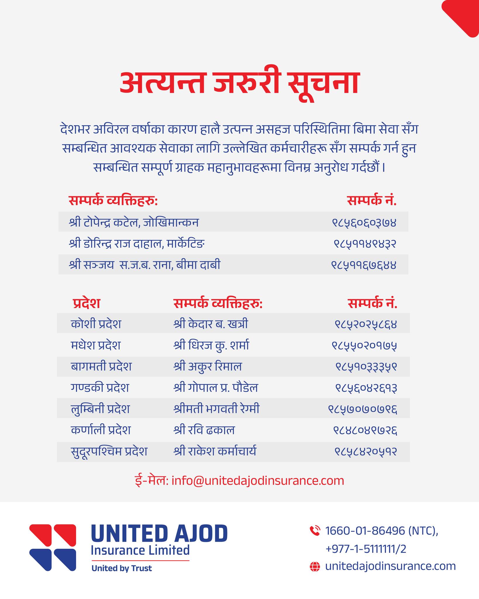 काठमाडौं । असोज १८ र १९ गतेको अविरल वर्षाका कारण उत्पन्न क्षति बापतको दाबी भुक्तानीका लागि यूनाइटेड अजोड इन्स्योरेन्स लिमिटेडले सम्पर्क व्यक्ति तोकेको छ।