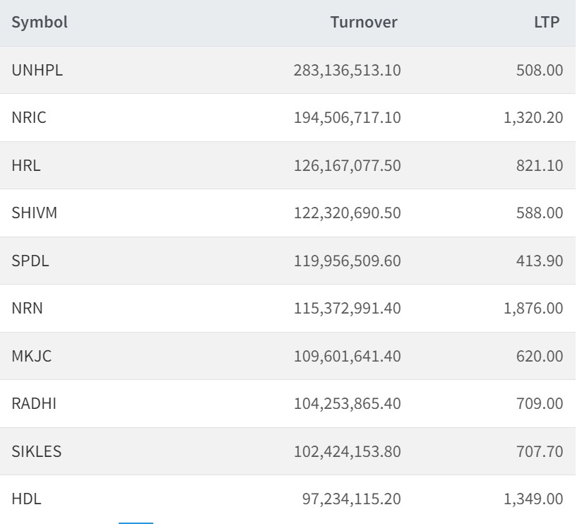 जसमध्ये युनियन हाइड्रोपावरको सर्वाधिक २८ करोड ३१ लाख रुपैयाँ, नेपाल रिको १९ करोड ४५ लाख रुपैयाँ, हिमालयन रिको १२ करोड ६१ लाख रुपैयाँ र शिवम् सिमेन्टको १२ करोड २३ लाख रुपैयाँमाथिको शेयर कारोबार भएको छ।