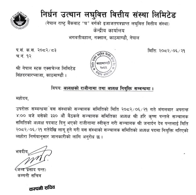काठमाडौं । निर्धन उत्थान लघुवित्त वित्तीय संस्था लिमिटेडको अध्यक्षमा जनार्दन देव पन्त नियुक्त भएका छन् ।