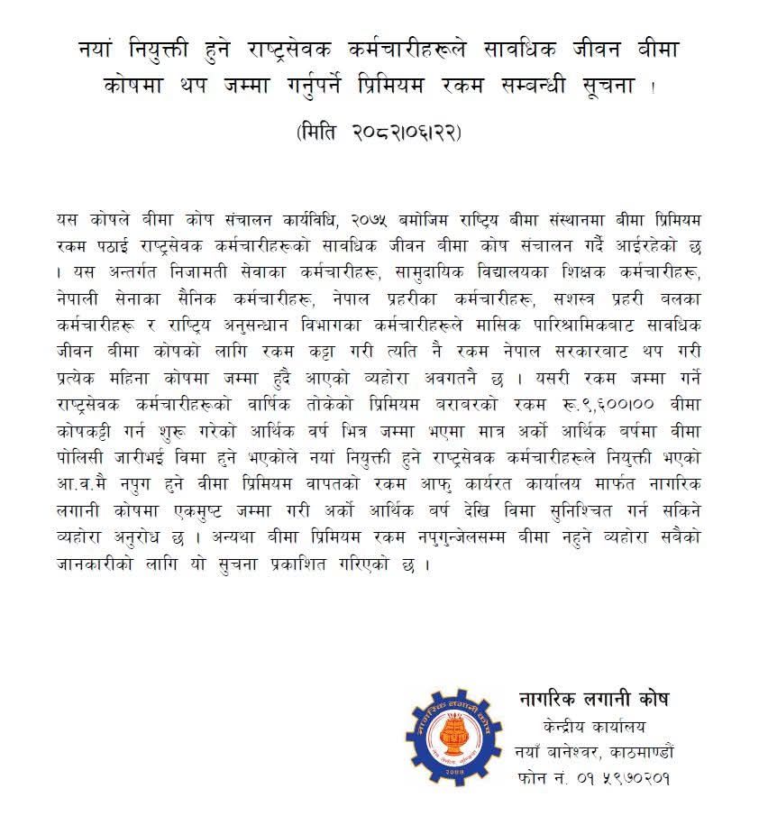 कोषले एक सार्वजनिक सूचना जारी गर्दै एक आर्थिक वर्षमा नयाँ नियुक्त कर्मचारीले आर्थिक वर्षमै नपुग बीमा प्रिमियम रकम कार्यालयमार्फत कोषमा एकमुष्ट जम्मा गर्न सकिने जनाएको हो ।
