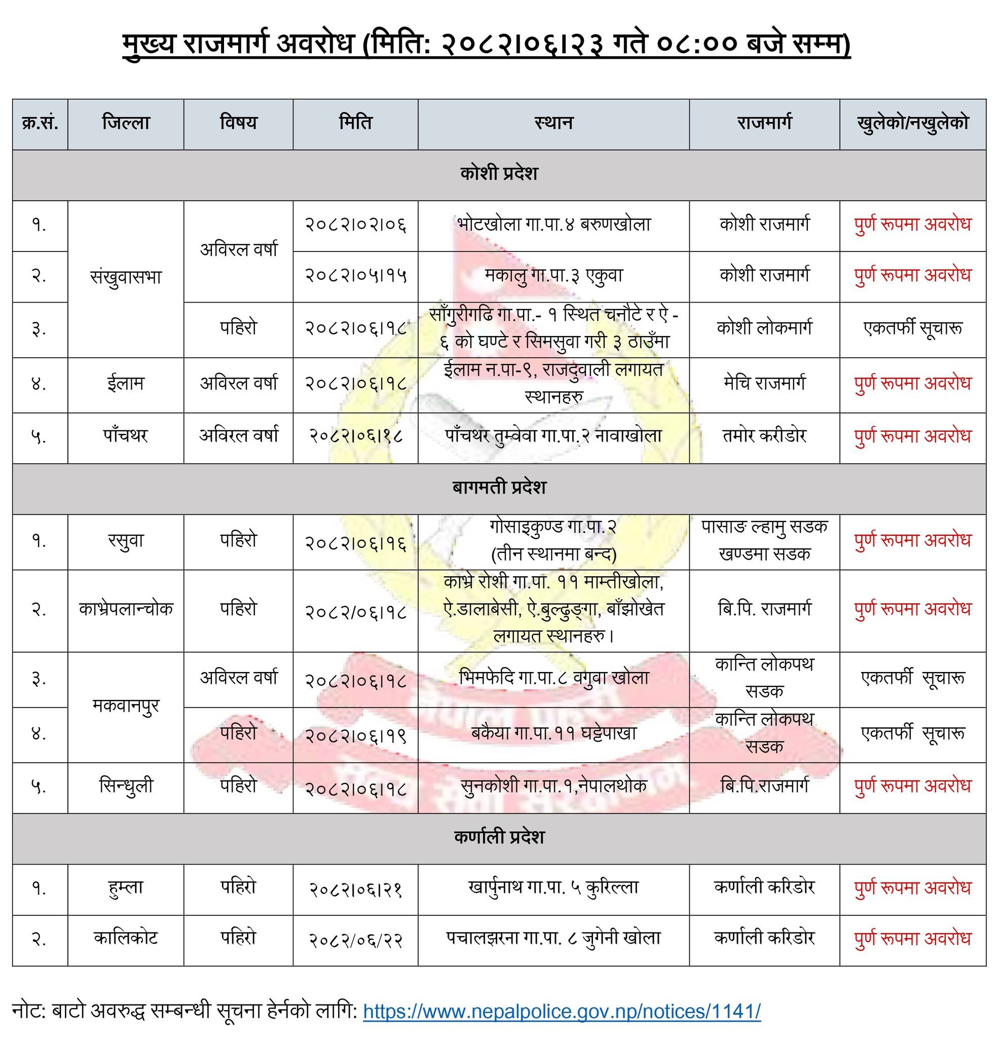 काठमाडौं । नेपाल प्रहरीका अनुसार आजसम्म पनि देशभरका विभिन्न स्थानहरूमा बाढी, पहिरो तथा अविरल वर्षाका कारण राजमार्गहरू अवरुद्ध अवस्थामा रहेका छन्।