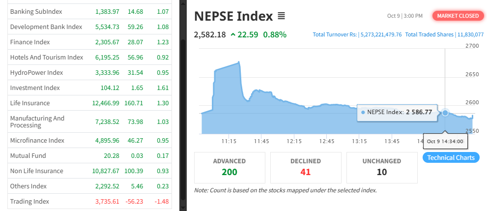 नेपाल स्टक एक्सचेञ्ज (नेप्से) २२.५९ अकंले घटेर २५८२.१८ बिन्दुमा कायम भएको छ । आज ३१३ कम्पनीको १ करोड १८ लाख ३० हजार कित्ता शेयर किनबेच हुँदा ५ अर्ब २७ करोडको कारोबार भएको हो ।