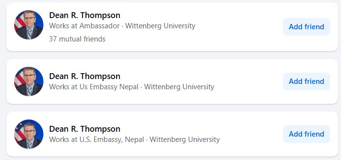 काठमाडौं । काठमाडौंस्थित अमेरिकी राजदूत डिन आर थम्पसनको नाममा सामाजिक सञ्जाल फेसबुकमा नक्कली आईडी बनाएर विभिन्न प्रतिष्ठित व्यक्तिहरुसँग साथी बनाएर कुराकानी गर्ने गरेको तथ्य फेला परेको छ ।