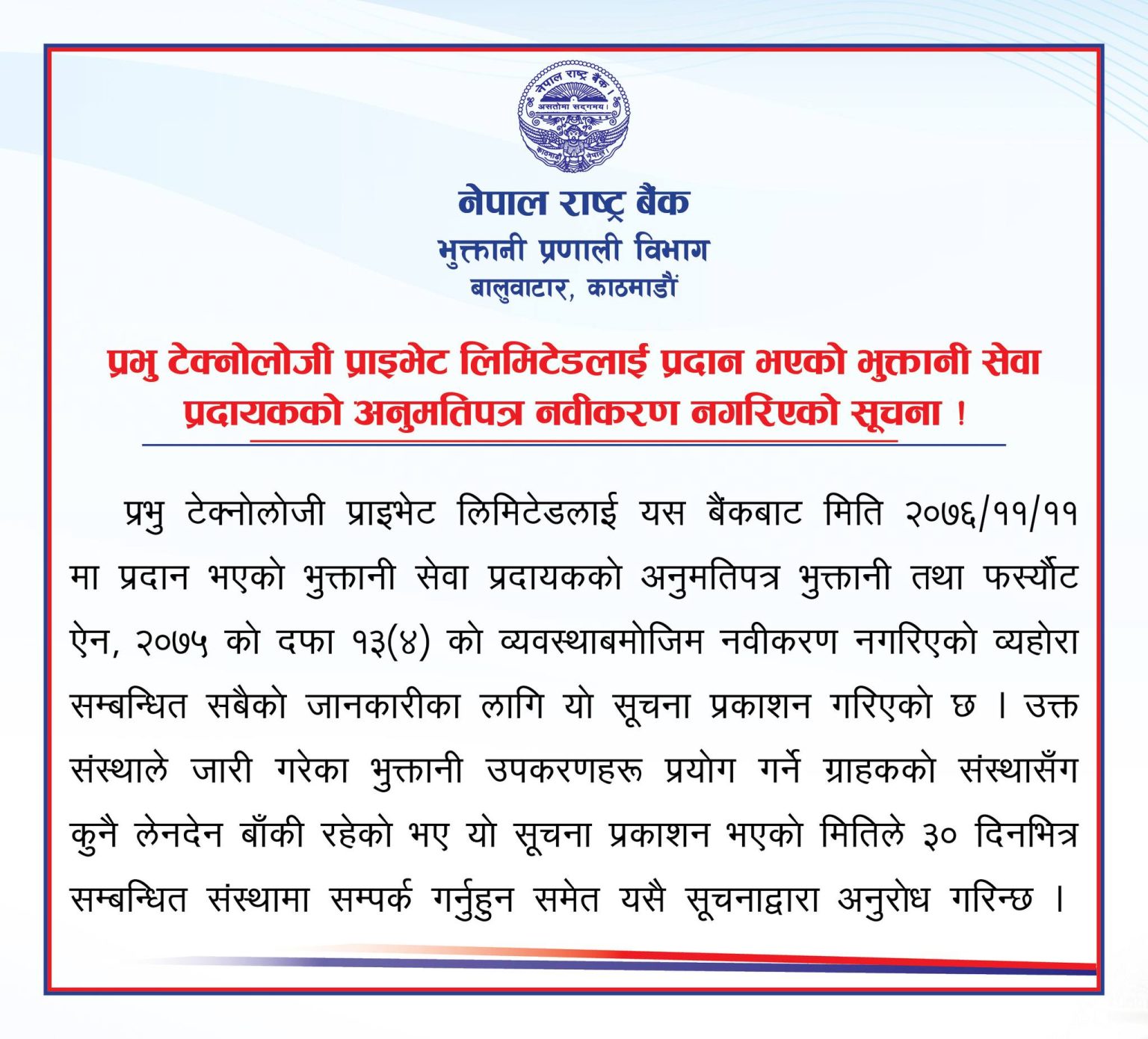 काठमाडौं । नेपाल राष्ट्र बैंकले प्रभु टेक्नोलोजी प्राइभेट लिमिटेडलाई दिइएको भुक्तानी सेवा प्रदायकको अनुमतिपत्र नवीकरण नगर्दा कम्पनीको डिजिटल वालेट सेवा ‘प्रभु पे’ बन्द हुने भएको छ । राष्ट्र बैंकको भुक्तानी प्रणाली विभाग बालुवाटारले जारी गरेको सूचनामा कम्पनीले मिति २०७६।११।११ मा प्राप्त अनुमतिपत्र दफा १३ (४) बमोजिम नवीकरण गराउन नसकेको कारण यो निर्णय गरिएको जनाएको हो।