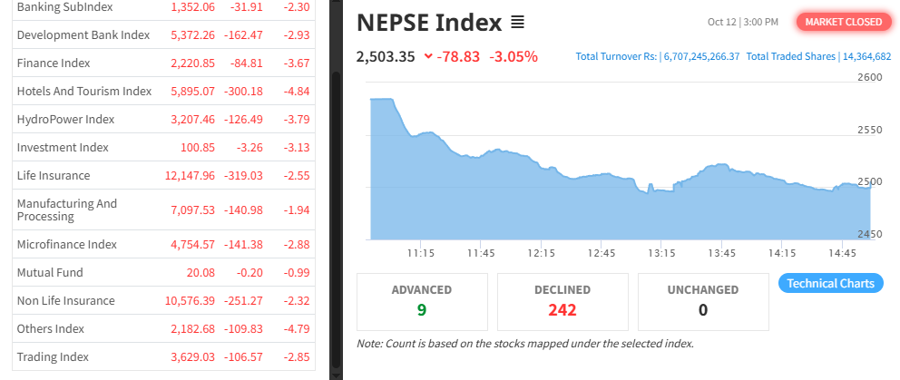 नेपाल स्टक एक्सचेञ्ज (नेप्से) ७८.८३ अकंले घटेर २५०३.३५ बिन्दुमा झरेको छ । आज ३२४ कम्पनीको १ करोड ४३ लाख ६४ हजार कित्ता शेयर किनबेच हुँदा ६ अर्ब ७० करोड ७२ लाख रुपैयाँको कारोबार भएको हो ।